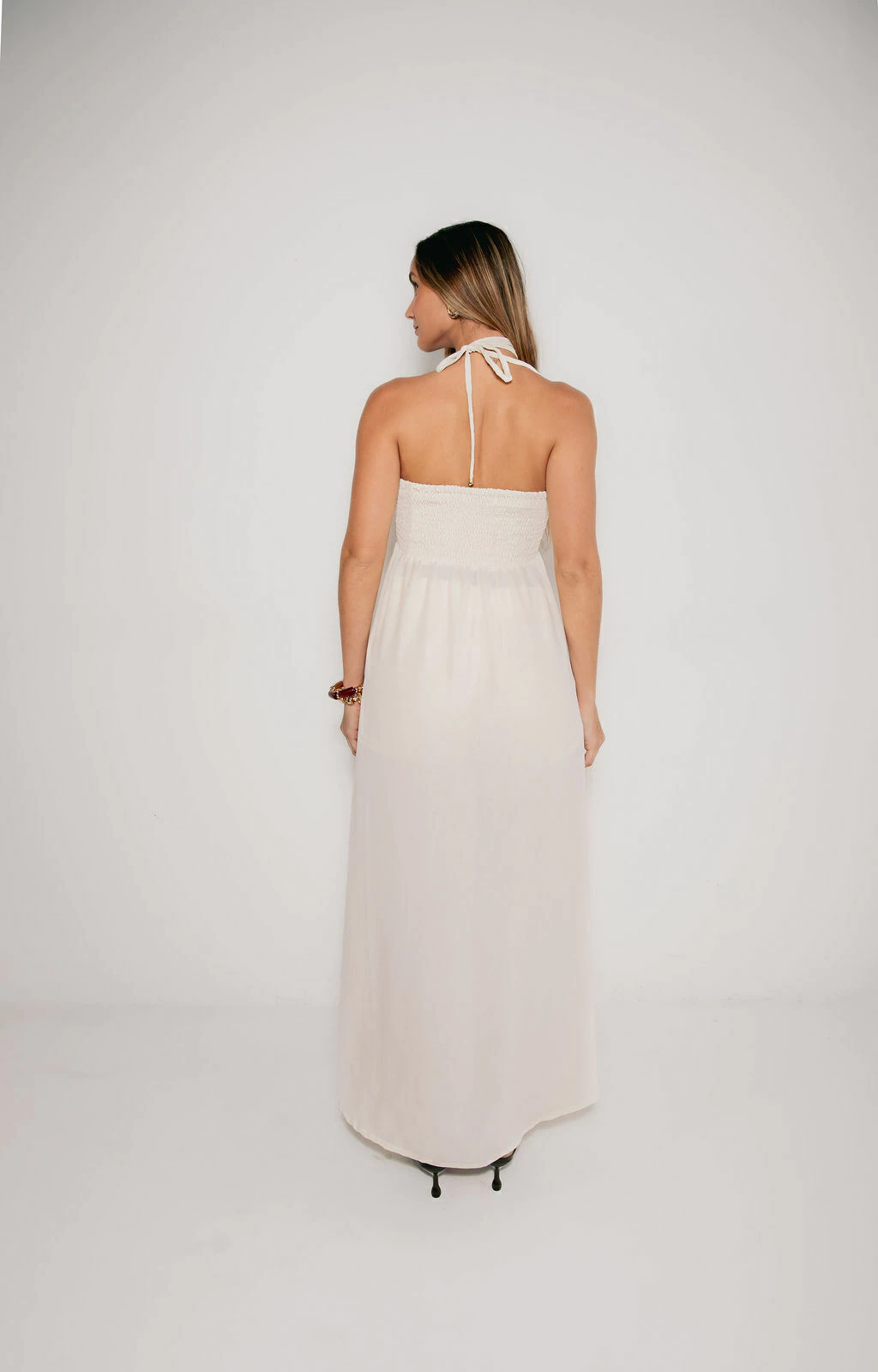 Bata longa com abertura frontal com amarração. Possui lastex nas costas para maior conforto.